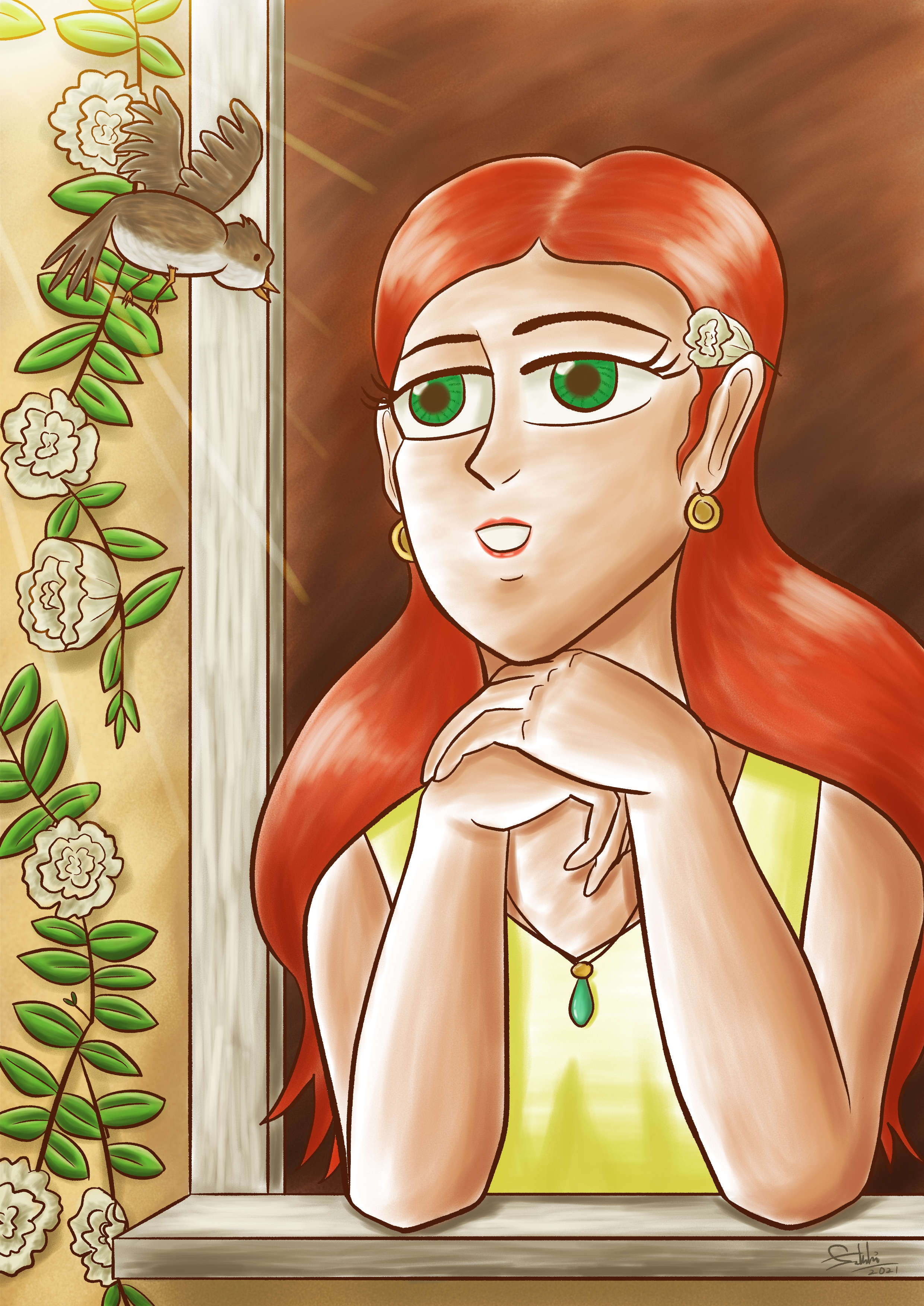 Ukuran : 29,7 cm x 42 cm Tahun : 2021 Deskripsi : Dipagi hari, seorang gadis yang barusaja bangun pagi dan berias diri menatap keluar melalui jendela kamarnya, disapa oleh seekor burung yang bercicit dihadapannya.