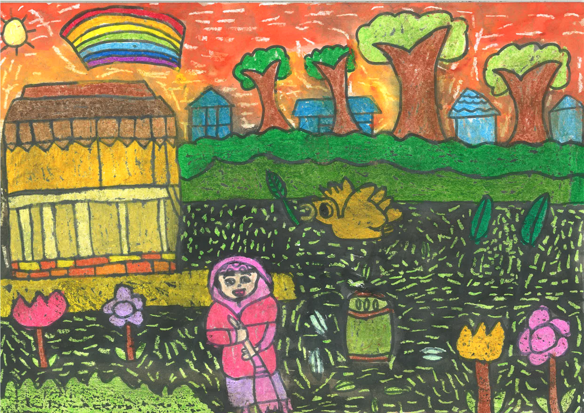 Tema lukis yang sederhana dalam kehidupan sehari hari namun dengan kombiasi garis tepi, teknik garis dan warna yang membuat menarik