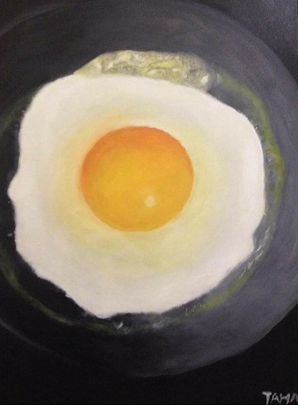 Ukuran : 90 cm x 70 cm Tahun : 2019 Deskripsi : Terinspirasi dari kesehariannya di rumah, Taha (nama panggilan pekarya) senang melihat ibu memasak telor ceplok untuk sarapan pagi. Bentuknya yang unik maka Taha terinspirasi untuk membuat lukisan telor ceplok.