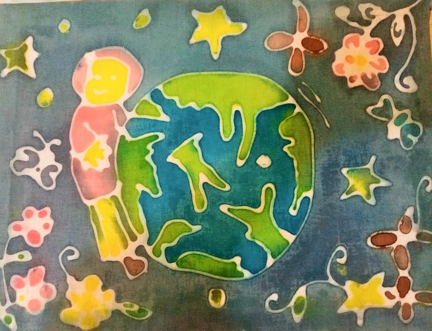 Ukuran : 30 cm x 40 cm Tahun : 2021 Deskripsi : Lukisan batik ini dibuat berdasarkan ketertarikan Aulia pada bunga- bunga dan visual dirinya terhadap bumi.